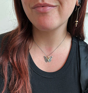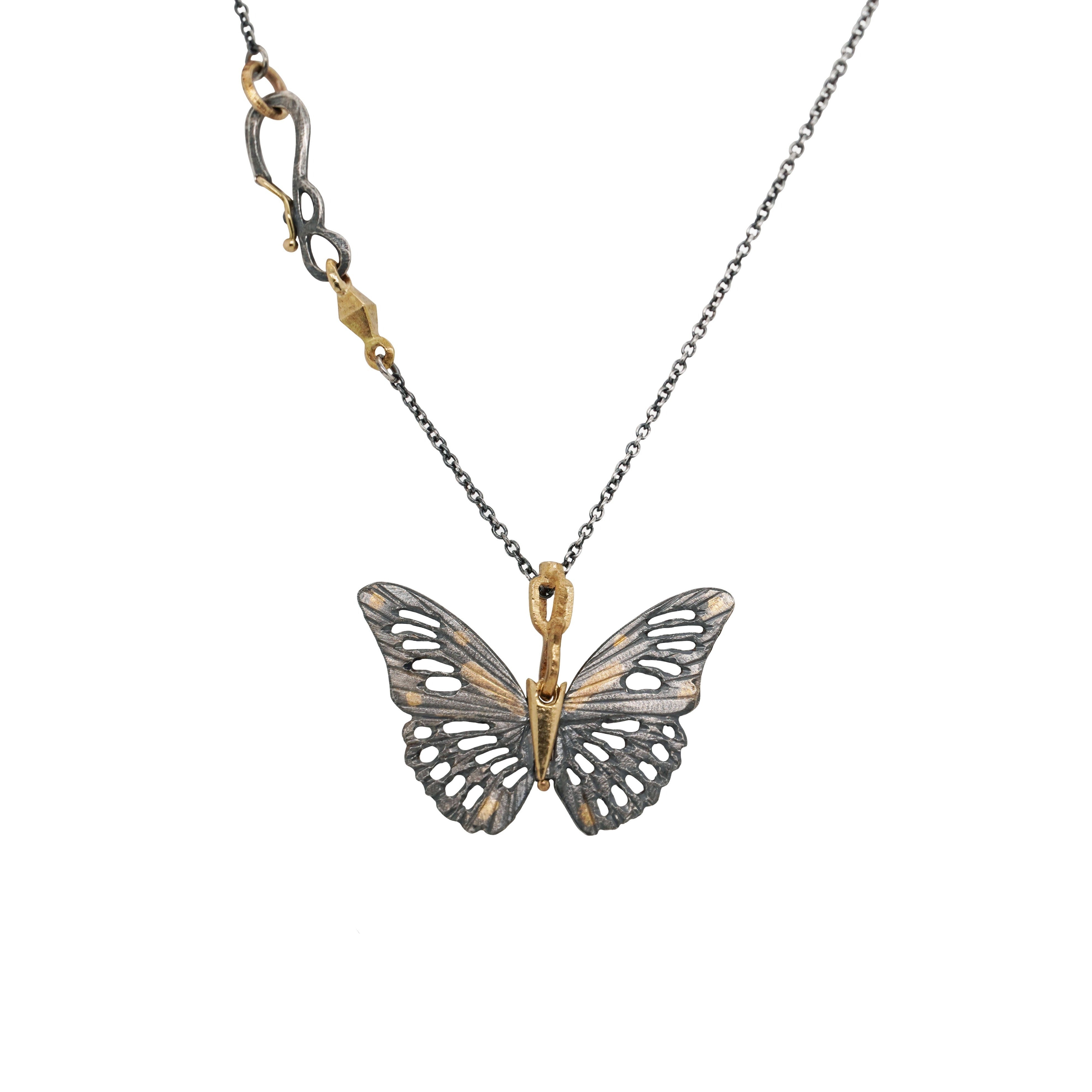 From James Banks Design, this intricate, saw-pierced monarch butterfly is is made out of sterling silver featuring 18k yellow gold inlay. The center is hinged and articulated, making the necklace move beautifully on the neck. The butterfly hangs from a hand crafted scepter bail with a deep purple amethyst set on top, a special benefit for the wearer.