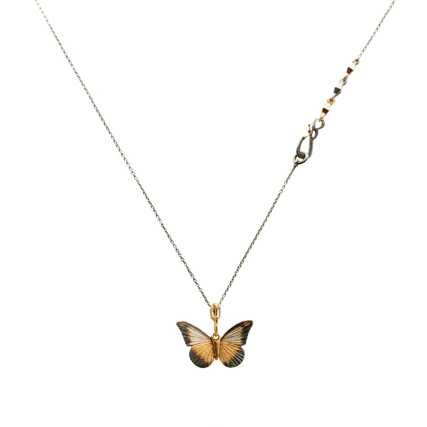 This beautiful, articulated butterfly from James Banks is composed 14K white gold, 18K yellow gold, and sterling silver with a 14k gold "scepter" bail set with a diamond on an oxidized sterling silver chain.