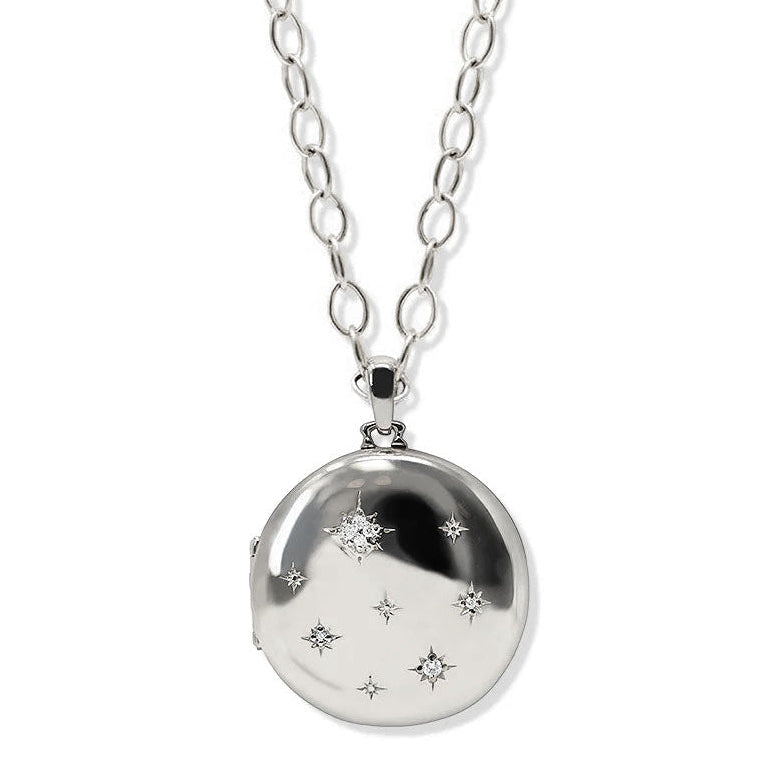 By Anzie, this celestial locket is suspended from a long sterling silver chain featuring a cluster of stars set with white sapphires. This necklace is an ideal keepsake piece for adding a bold statement to any attire.