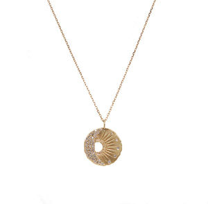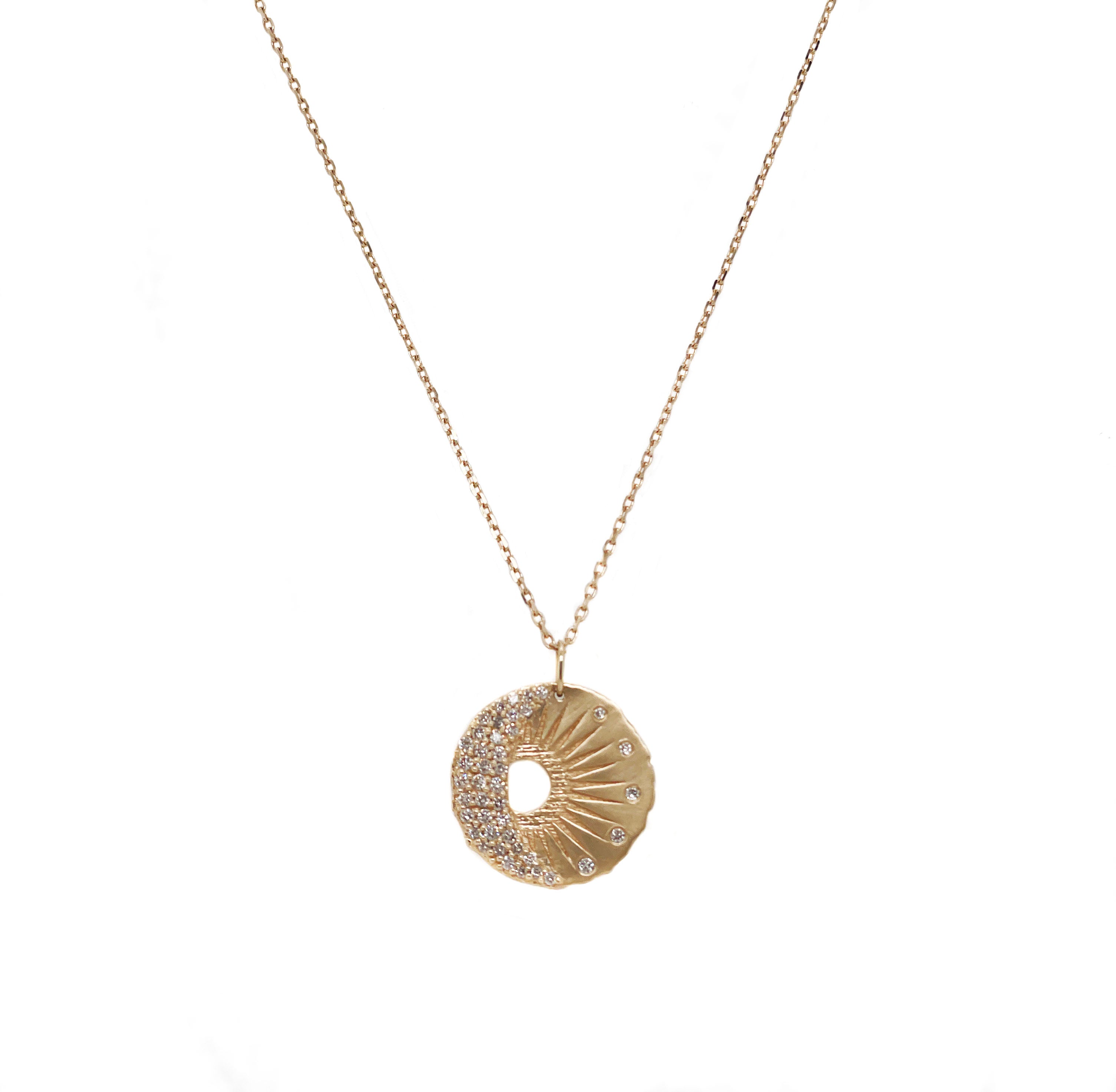 Celine Daoust’s lovely 14K yellow gold Sun and Moon Necklace with diamonds. The moon and sun are powerful symbols; together, they balance the forces of life.