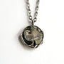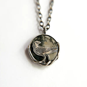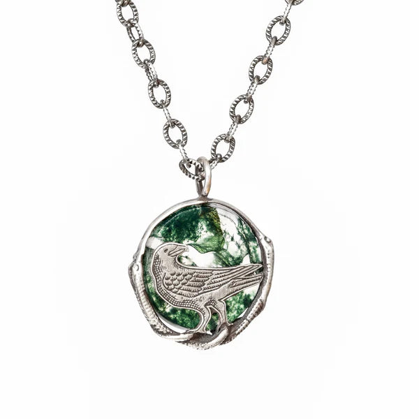 This sterling silver necklace from Digby and Iona features a crow over an old stock moss agate inlay, surrounded by a snake wrapping arond the pendent, hanging from a 25 inch oxidized sterling silver chain.