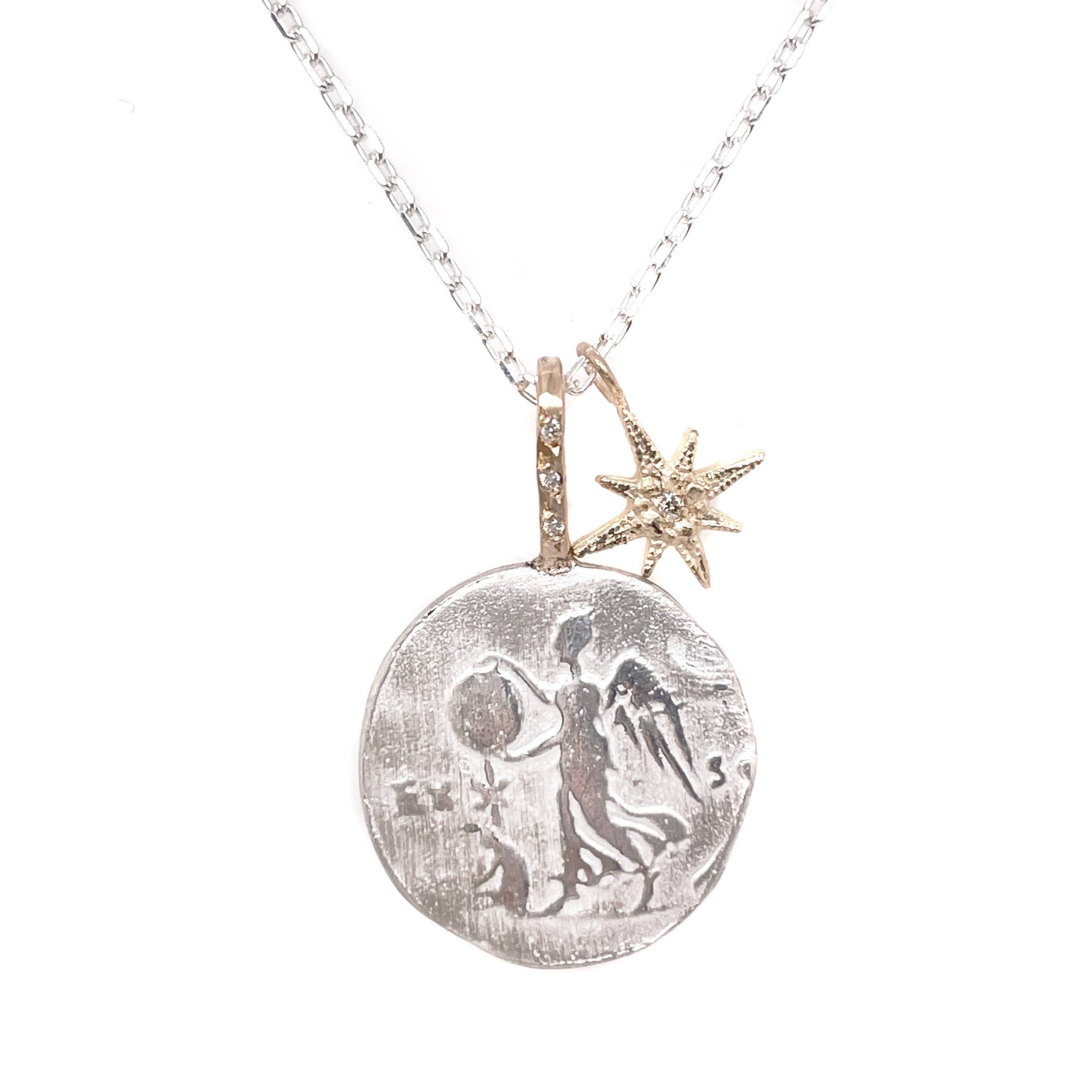 This sterling silver and 14K yellow gold necklace from Robin Haley's artifact collection features a pendant cast from an ancient coin with a 14K yellow gold and white diamond gratitude star accent. Bale is 14K yellow gold and is set with three white diamonds. Pendant hangs from a sterling silver chain.