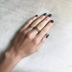 From TAP by Todd Pownell, a wavy band with 5 thin rows in rose gold with diamonds dispersed throughout.