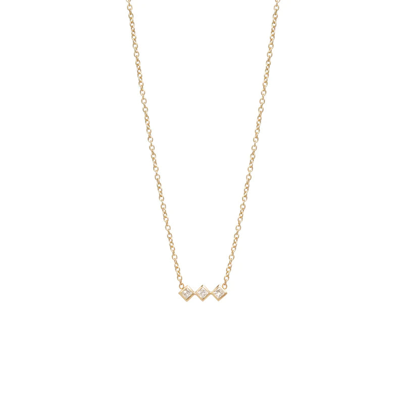 14k gold chain necklace with a bar pendant of three tiny bezel set white princess diamonds