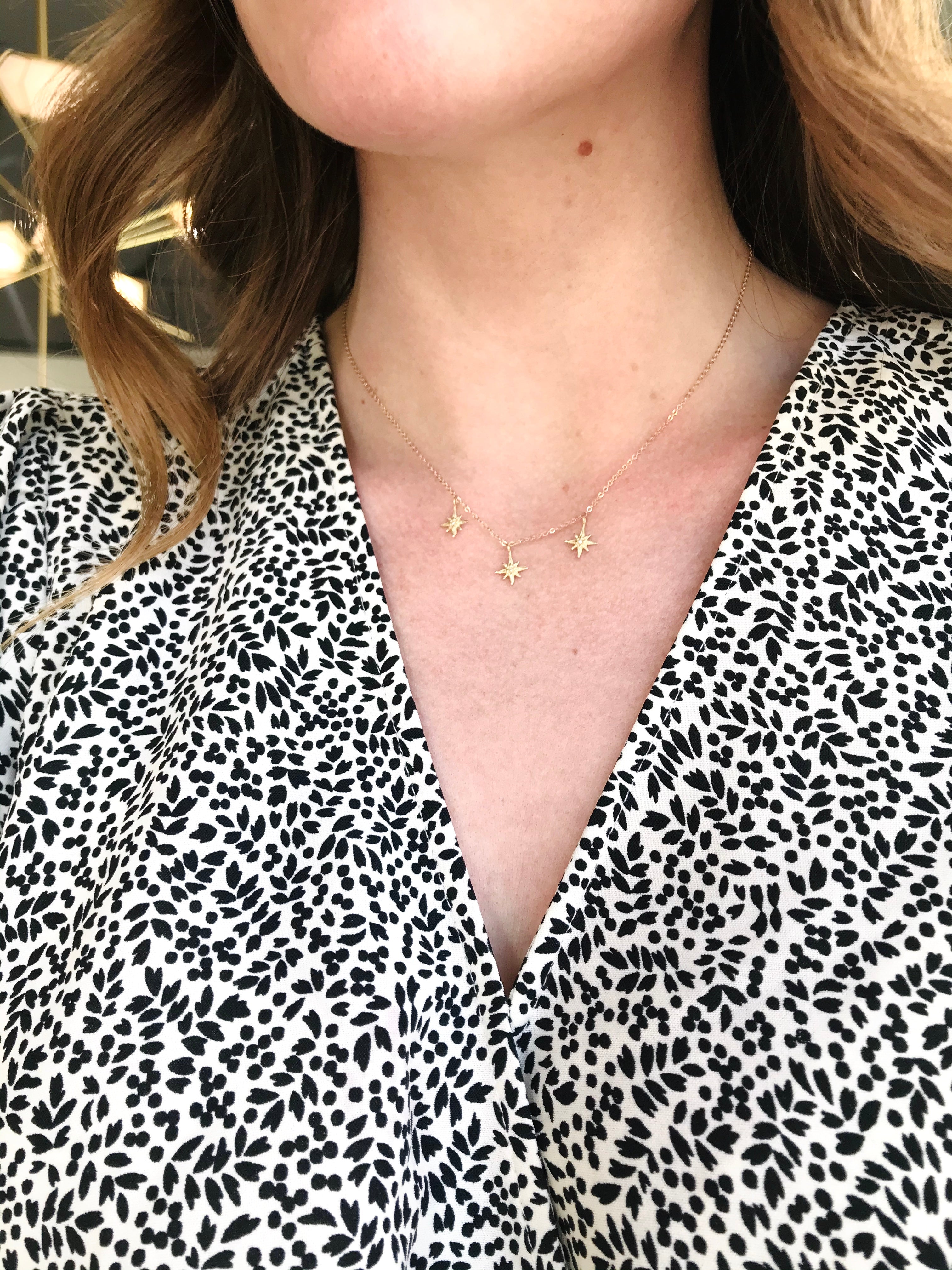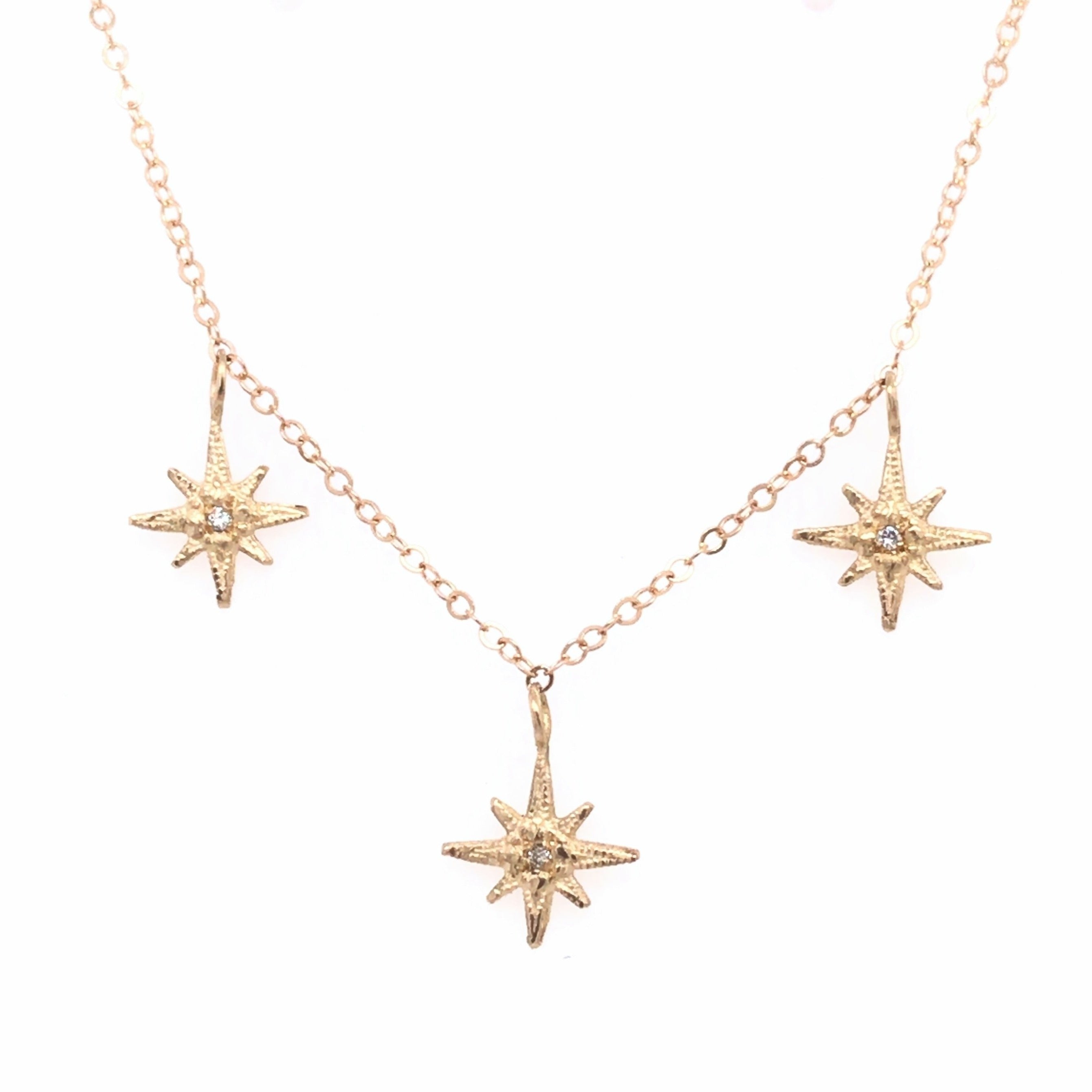 This 14K yellow gold necklace from Robin Haley features three of her gratitude stars with a single brilliant cut diamond set at the center of each.