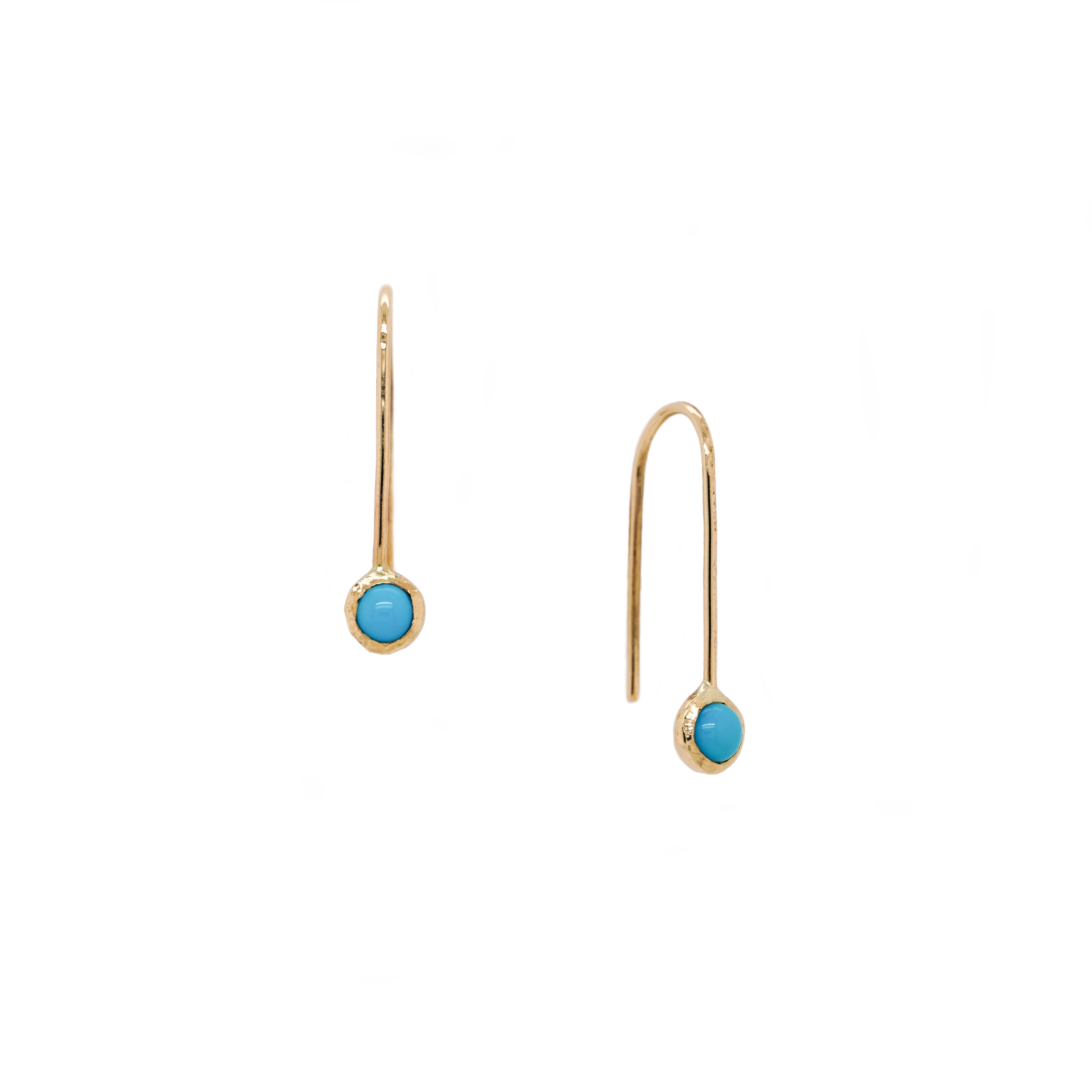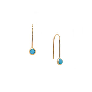 From Misa Jewelry, these earrings are made out of 14k yellow gold featuring two bezel set turquoise.