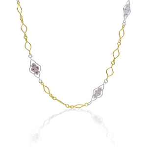 Made by Adel Chefridi, this romantic lacy link necklace features intertwined 18K yellow gold and sterling silver links. The sterling silver links are illuminated by rubies, which add dimension to this lovely necklace.