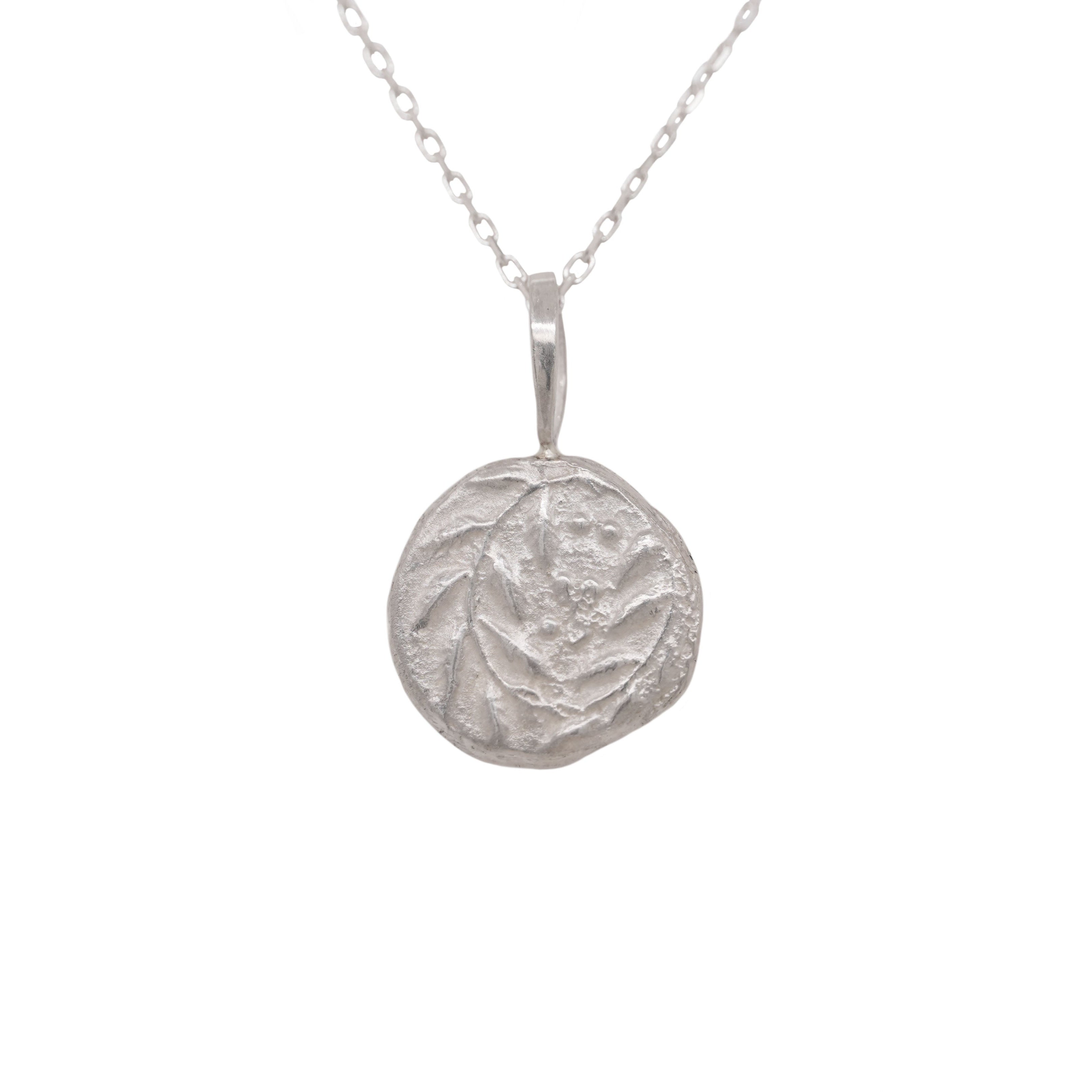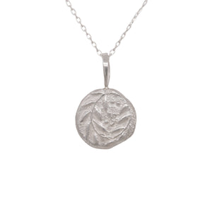 This necklace from Robin Haley features a sterling silver pendant cast from an ancient artifact from Sicily, 415 BC. The pendant hangs from an 18" sterling silver chain.