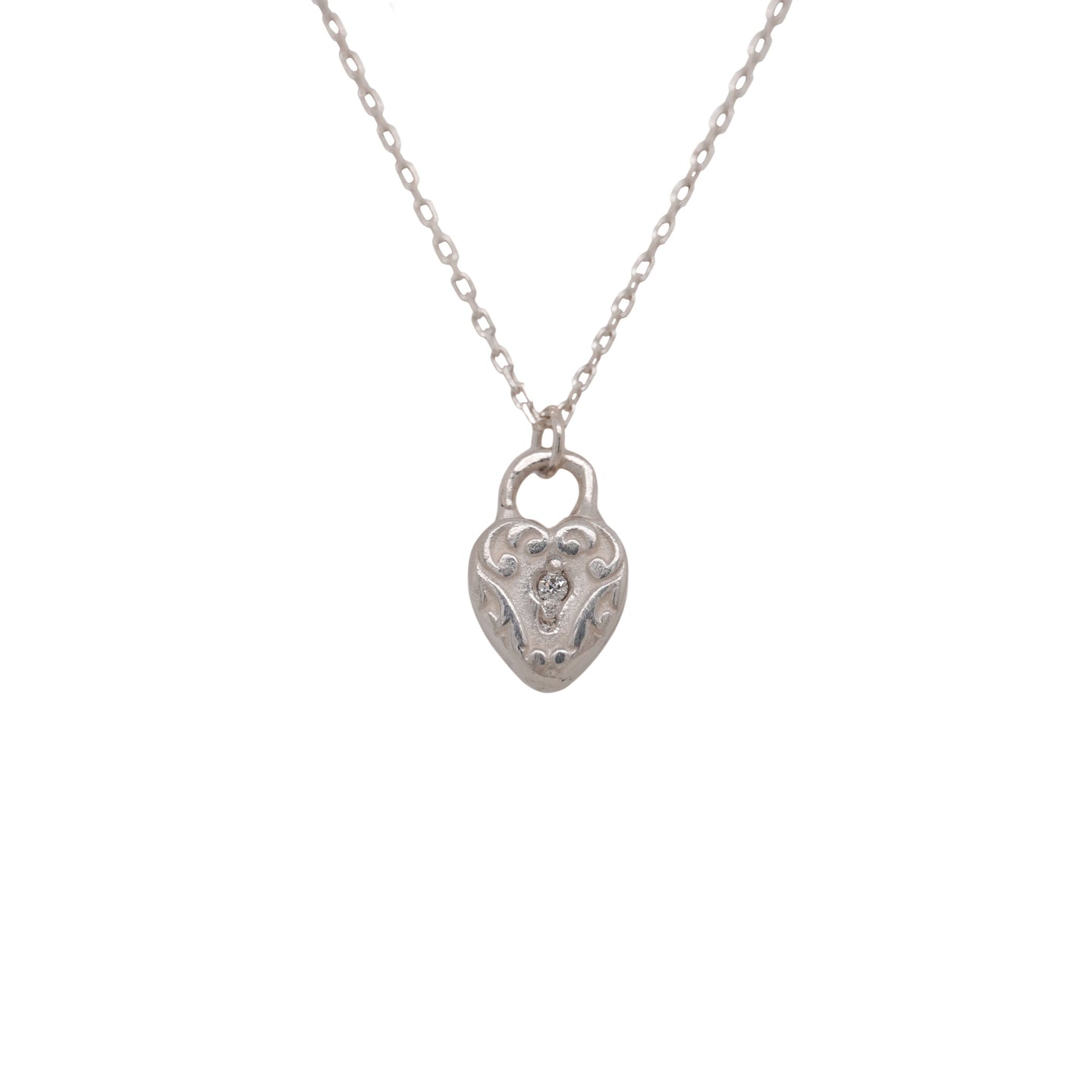 This necklace from Robin Haley features a sterling silver pendant cast from a heart shaped antique locket shape. The pendant has a sparkling white diamond set in its center and hangs from an 18" sterling silver chain.