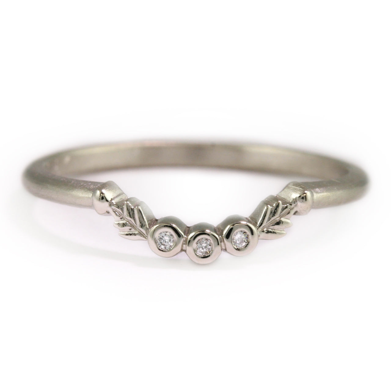 18K white gold ring guard from Megan Thorne with 3 consecutive round brilliant cut white diamonds bezel set in a delicate leaf motif. Can be worn with the Wood Nymph solitaire, in a stack or on it's own.