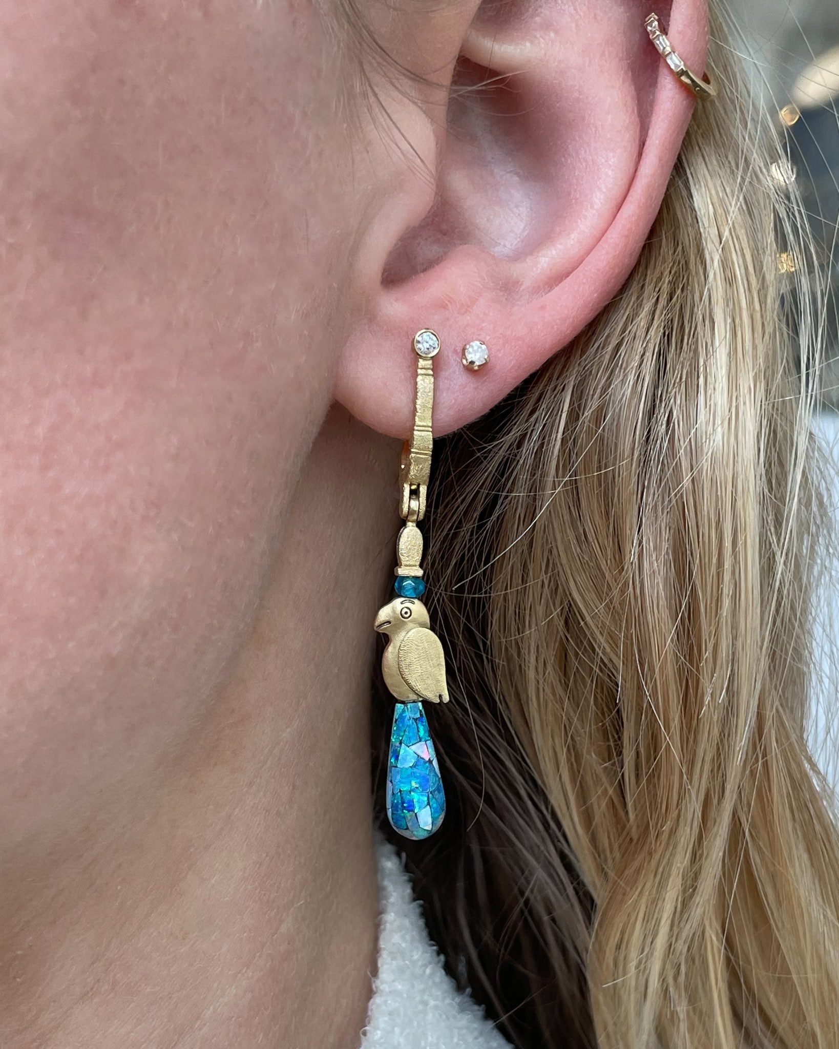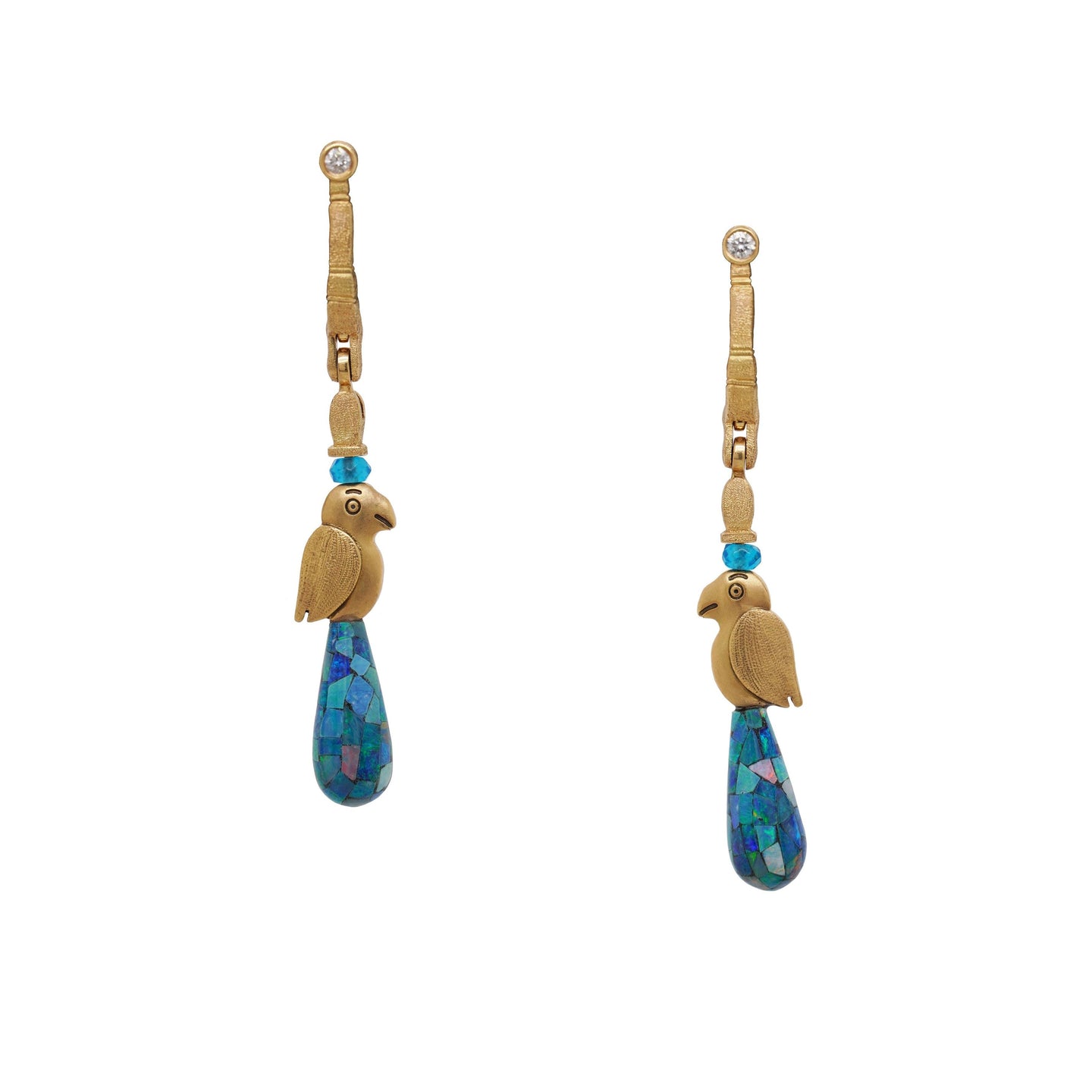From Alex Sepkus' "Sticks and Stones" series, these one-of-a-kind, playful and gorgeous earrings feature 18k yellow gold parrots atop a total of 7.16cts of mosaic opals. Faceted blue apatite beads sit atop the parrots. The diamond accents at the top total .11ct.