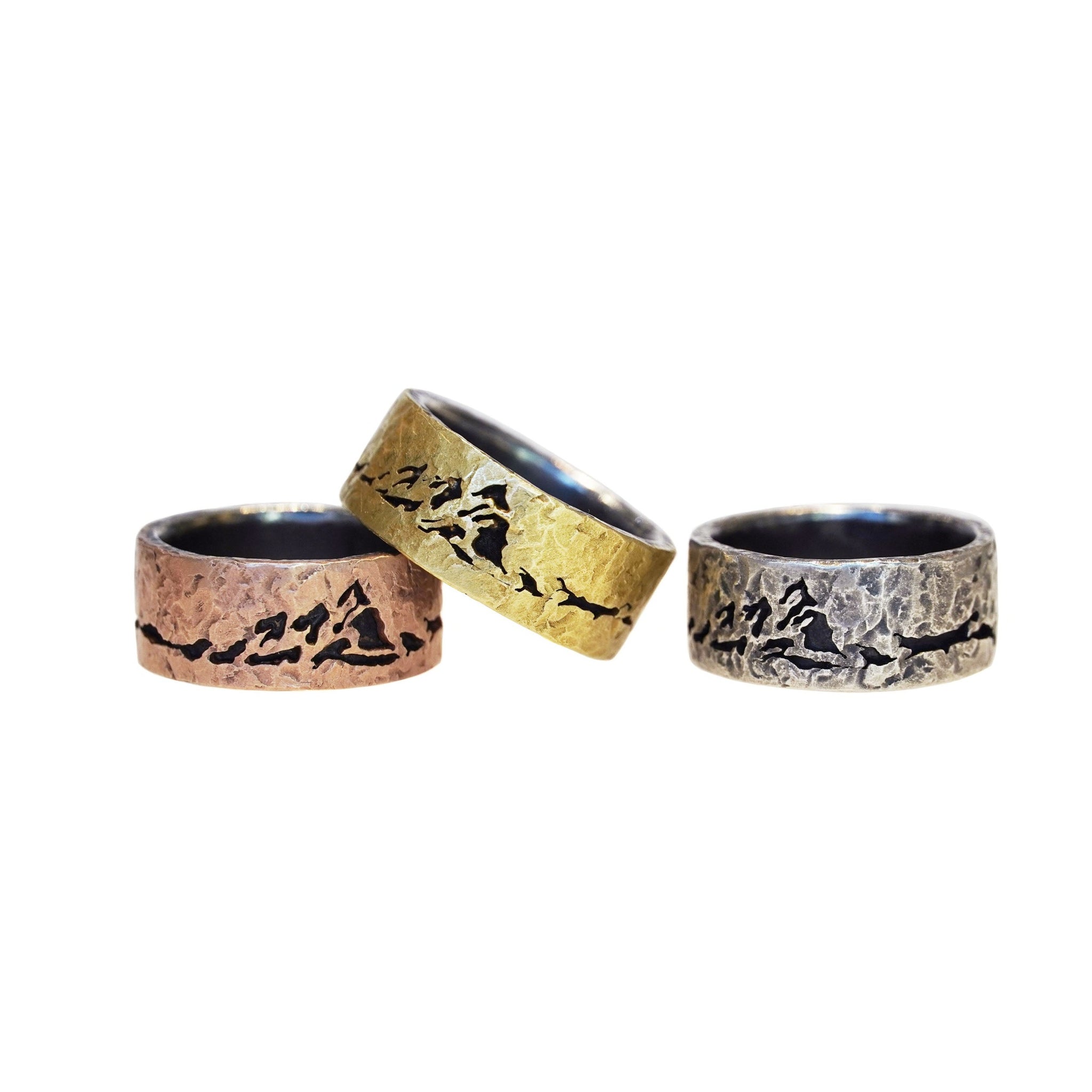 An exclusive to Art + Soul Boulder, this textured hammered band in yellow gold from TAP by Todd Pownell highlights a hand etched silhouette of Boulder's beautiful Flatirons.