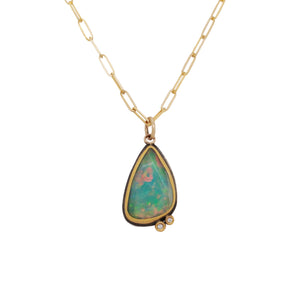 This beautiful necklace by Ananda Khalsa features an eye-catching rose cut Ethiopian opal set in warm 22k yellow gold with an oxidized sterling silver back and two sparkling white diamond accents. The pendant hangs from a 14k yellow gold paperclip chain.
